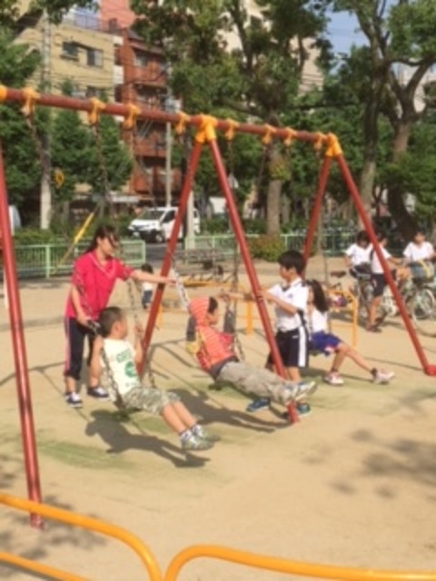 ブランコを先生に押してもらったり、限界に挑戦してブランコをこいだりしている子、さまざま!(^^)!