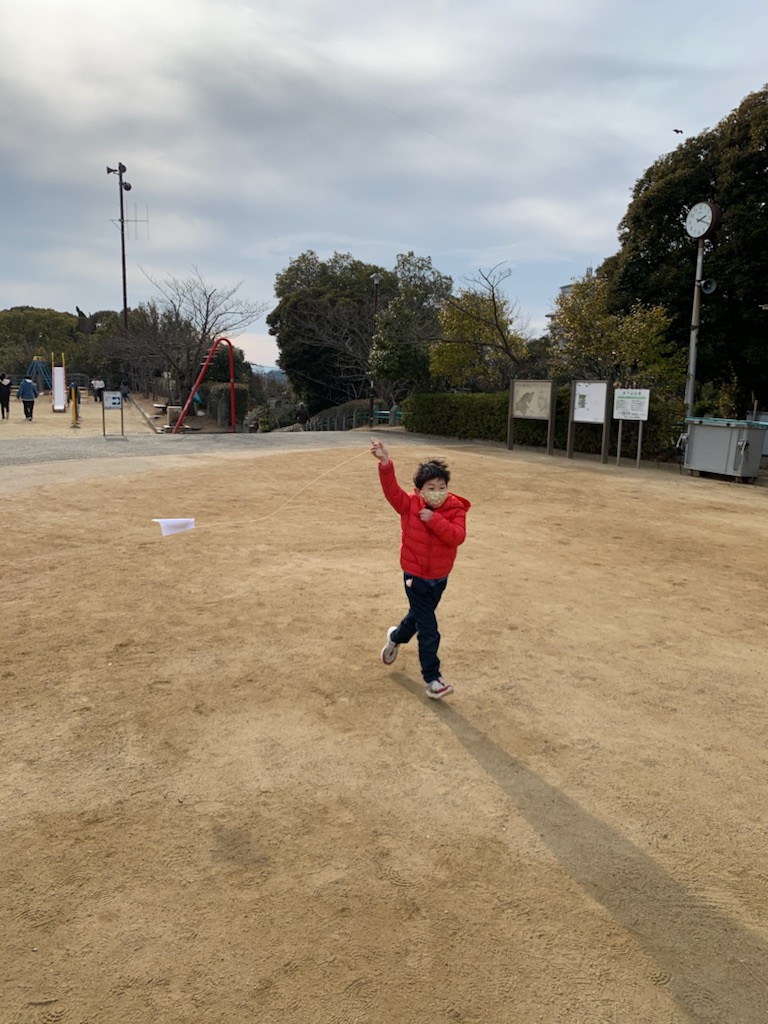 予想外にも、凧が高く舞い上がり、上手く飛ばせました。