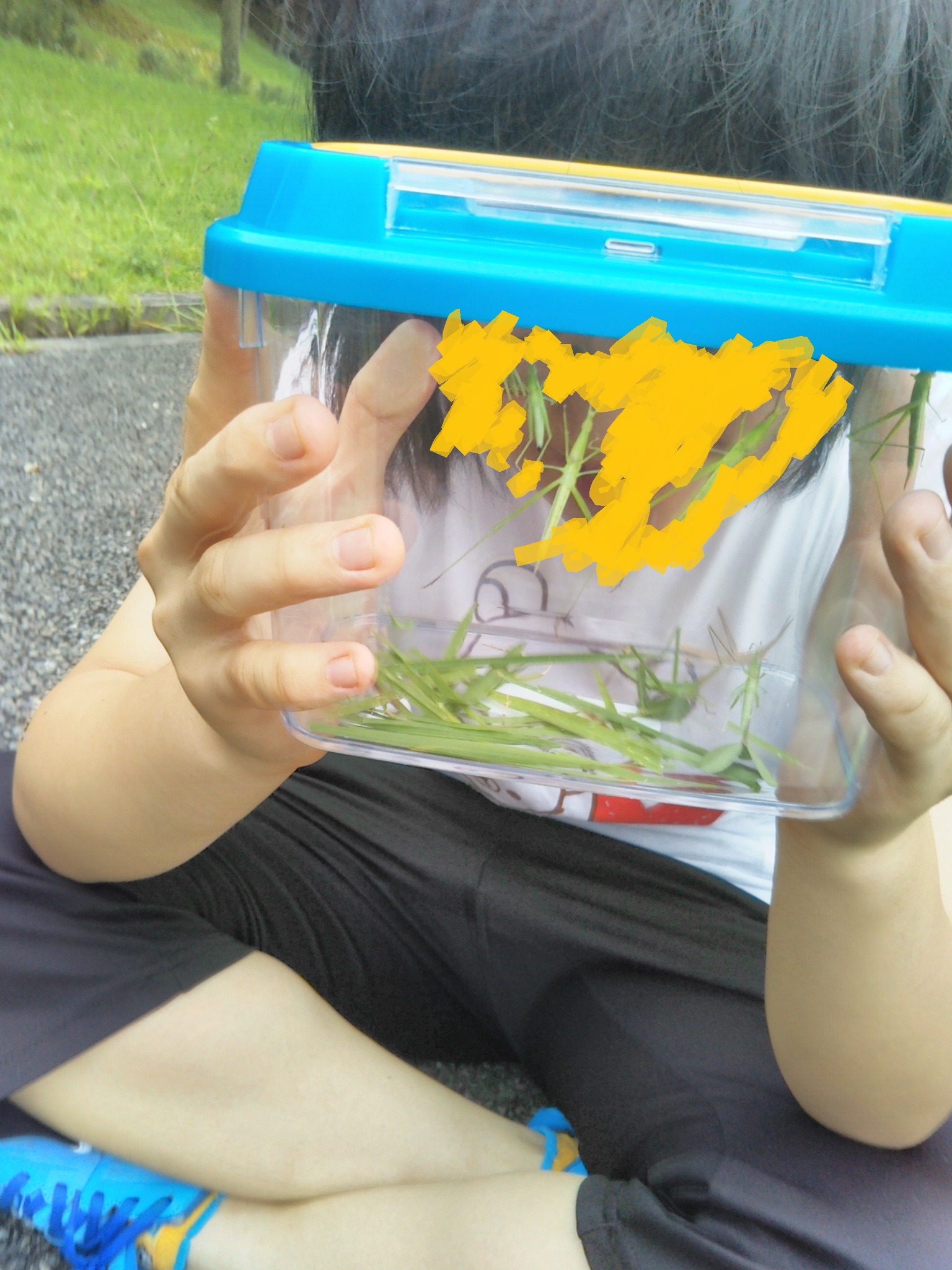 カブトムシ採りを諦めた子供たちは、代わりに草むらでバッタ採りをしました。