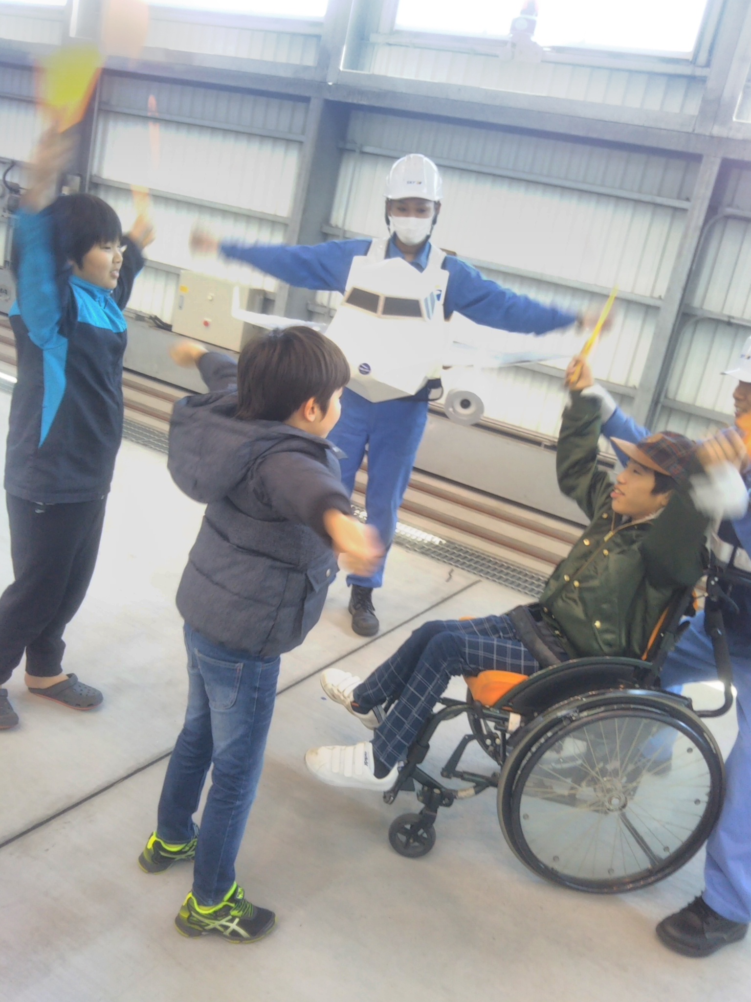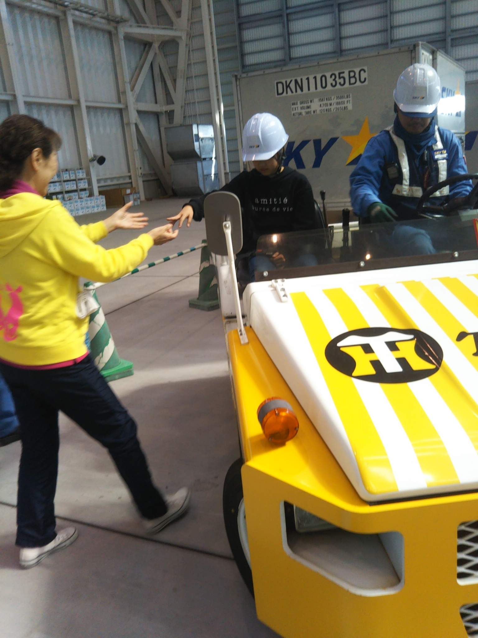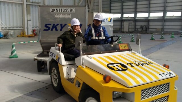 気分は空港の職員そのものです、荷物を運ぶ人、航空機を誘導するマーシャリングに必要な基本動作の体験など手ほどきをうけました。手ほどき後は、パドルをもってトラクターを飛行機に見立てて、マーシャリングをして誘導をしました。短時間の練習にしてはなかなかさまになっていました。