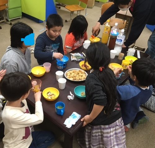 まず初めにみんなで一緒にスウィーツを作りました。スタッフの説明をみんな一生懸命に聞いています。