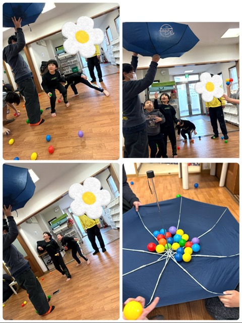 くじ引きでチームに分かれて、カラーボールを傘の中に投げ