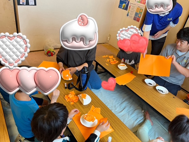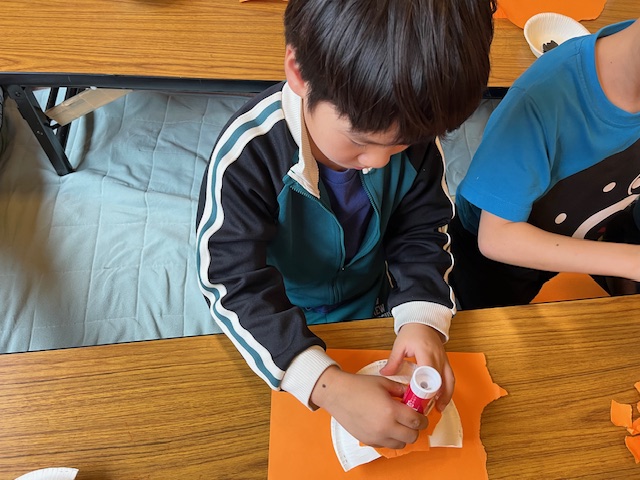 オレンジの画用紙を上手に貼り途中疲れて嫌になったご児童さんも
