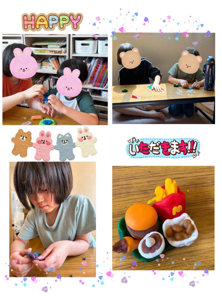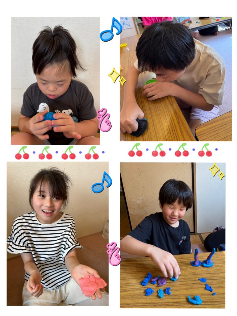 今日は、粘土工作をしました。お花をつくったり、青色のポートタワーをつくったりと、