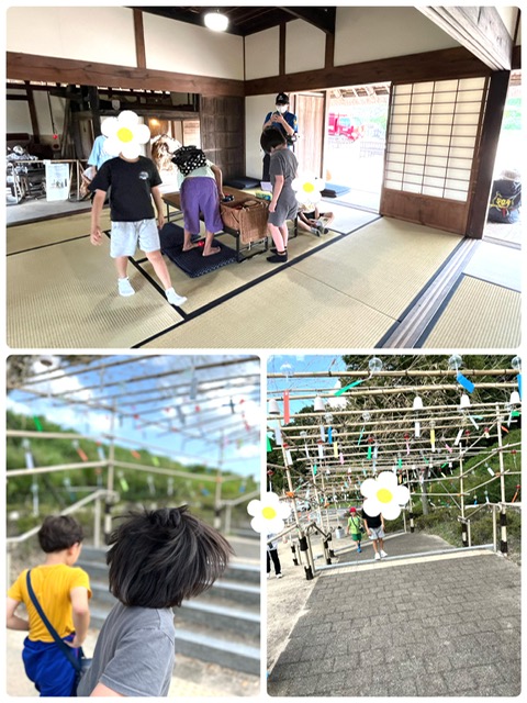 茅葺屋根の休憩所にみんな興味津々でお部屋の中では